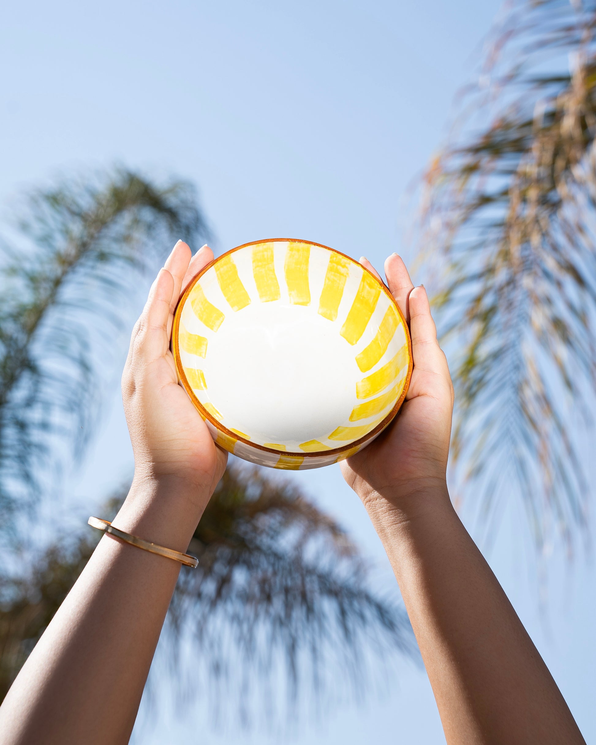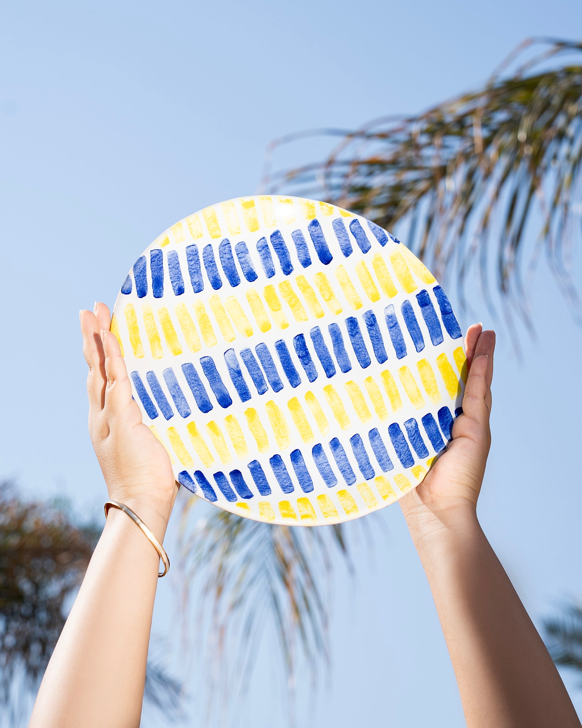 The Melt Collection celebrates color, movement, and joy. Featuring bold strokes of blue and yellow, each piece is hand-painted on pottery with patterns that feel alive — from sunburst rays to flowing stripes.